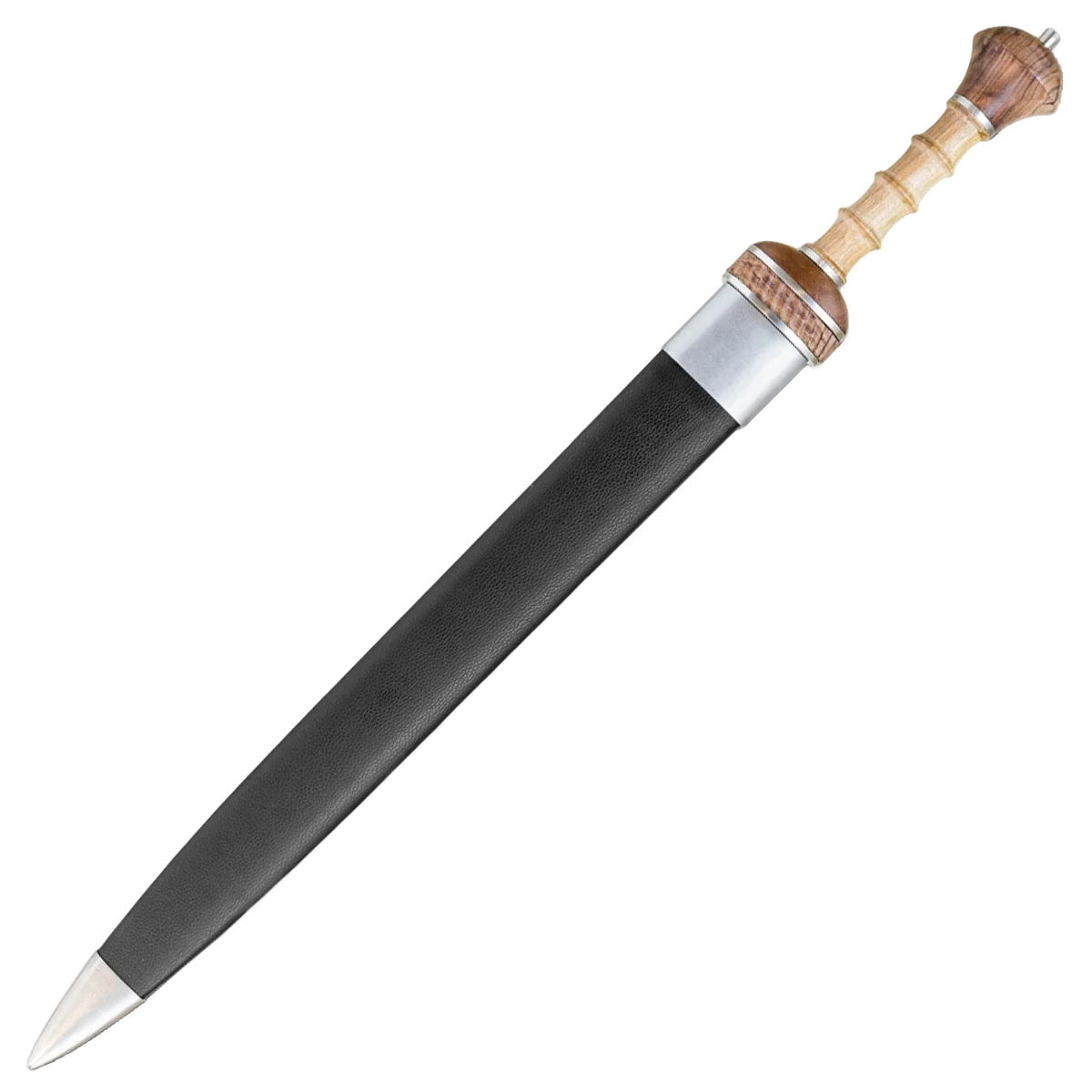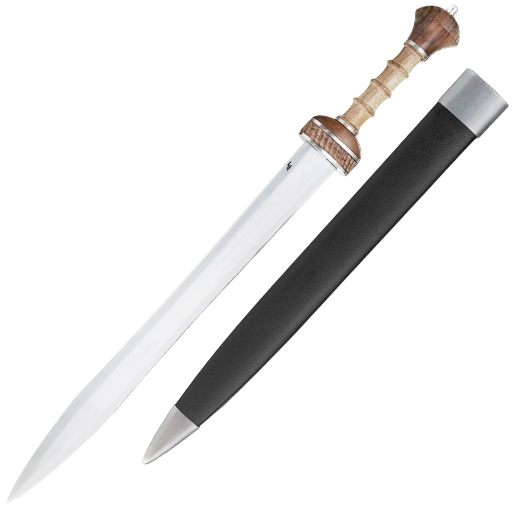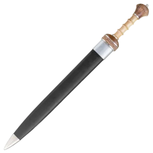 Most early versions of the Roman Gladius were wasp waisted with a long point that combined cutting power and thrusting ability in one. Some of the later versions were made with a straighter blade, but still with the long point. Even later versions (like the Pompeii pattern), were not waisted and also had a shorter point, but were just as effective and easier to make. Both swords served side-by-side for many years, and it was not uncommon to find 4th century Legionnaires carrying either models. The gladius is known as "the sword that conquered the world". This version features a high carbon blade, hard wood handle and a high polished steel spacer at the bottom of the handle for strength and durability. The sword also includes a wood scabbard wrapped in black leather with steel accents at the throat and tip.