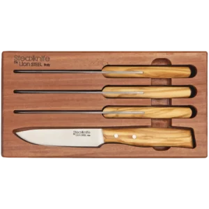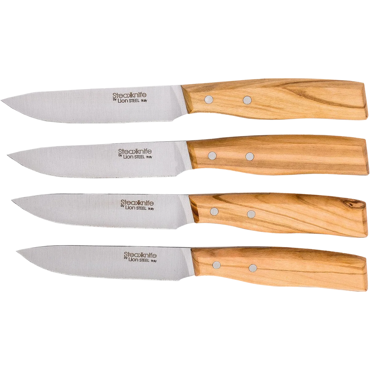 The Steak knife was created after receiving many requests from hunters and knife-lovers. They asked for a knife which could be used not only as working tool for hunting, but also to be shown to friends as a nice object during after-hunting dinners. The smooth, rounded olive wood handles are comfortable in hand with an intricate grain structure and half tang construction. 4 steak knives are supplied in the cedar wood storage box.
