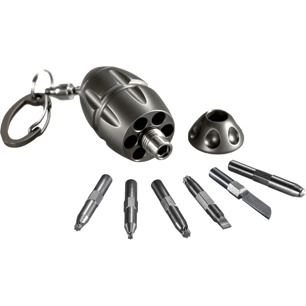 The Eggie is a fine designed keychain made out of Titanium and at the same time a suitable and reliable multitool. It is fully fitted with different stainless steel bits helpful in all situations, it includes: torx drivers in four sizes, the slot screwdriver, a tungsten carbide tip and a little straight blade. The central socket is equipped with a magnet and it is hex shaped so the tool stays stable when on duty. The Eggie can be fastened thanks to the titanium carabiner and it is available in grey, blue and bronze.