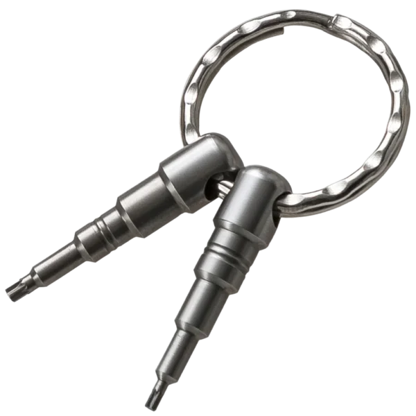 Keyring with heat treated Aisi 420 stainless steel Torx screwdrivers, in two different sizes: T6 and T8. Easy to use when in need of removing (or adding) either the flipper tab or the thumb-stud when possible, useful to adjust the pivot screw or the handle screws.
