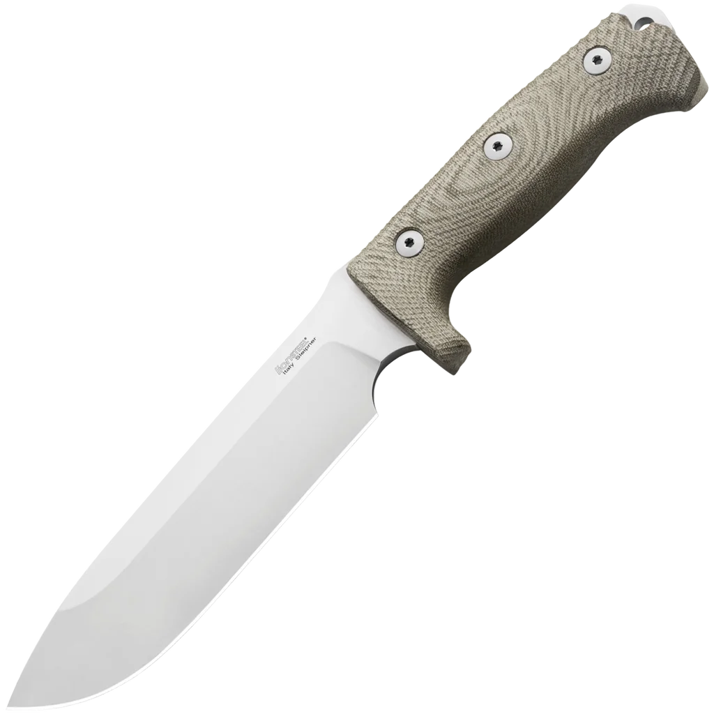 The biggest of lionSTEEL outdoor knives. Its large dimensions and extreme handiness allow a strong resistance to the most dissimilar camp uses, including chopping and batoning. It is a knife with a Micarta handle made with SOLID® knife technology. The M7 is equipped with a Sleipner stainless steel blade, which is available either satin finished or black coated. This kind of blade offers a special resistance to usage and an easy sharpening. The SOLID® knife handle, obtained from a 4D machined Micarta block, or a canvas handle makes the grip strong and safe, and guarantees the greatest strength at the same time. The M7 was designed by Molletta to answer the need to cut out tree branches during a challenging excursion, and, for this reason, the weight is mostly distributed on the blade. The M7 dimensions, weight and handiness make it the ideal companion for every outdoor activity.