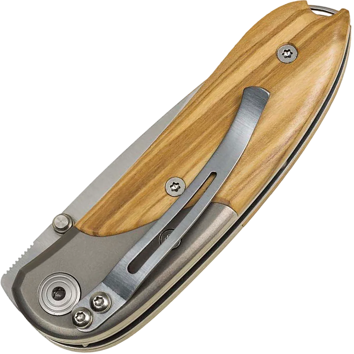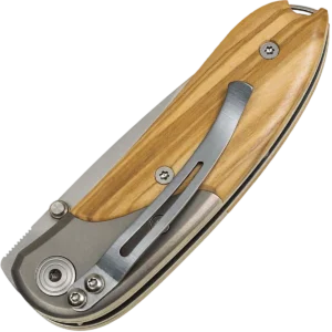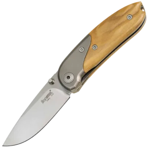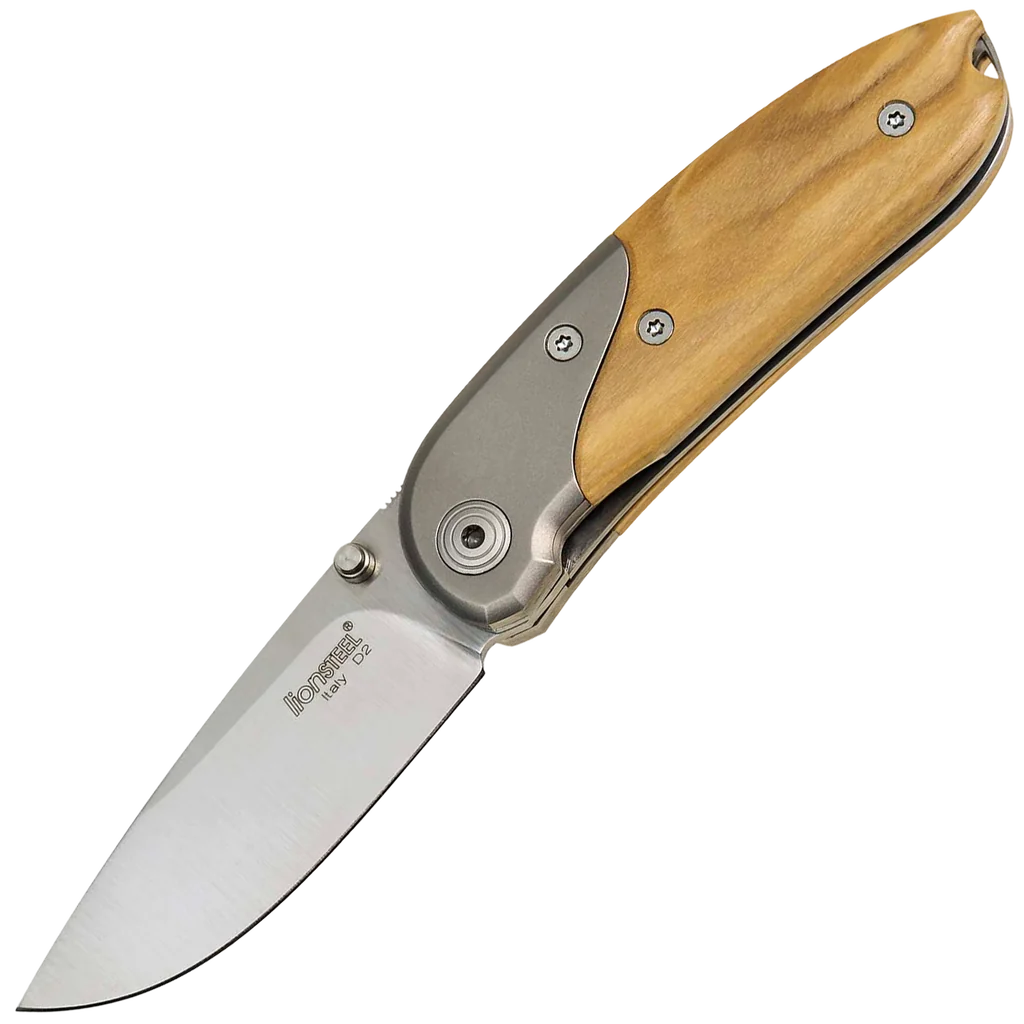 The LionSteel Mini knives feature a D2 tool steel blade and stout liner locks. This model has beautiful olive wood handle scales with matte finished Titanium bolsters. Comes with a small leather lanyard and removable pocket clip.