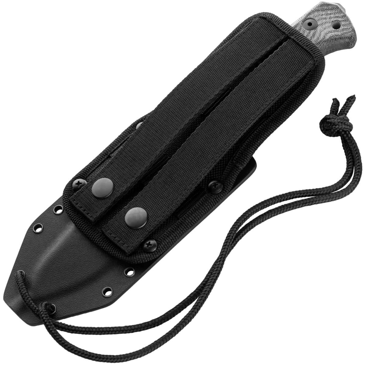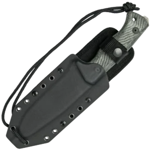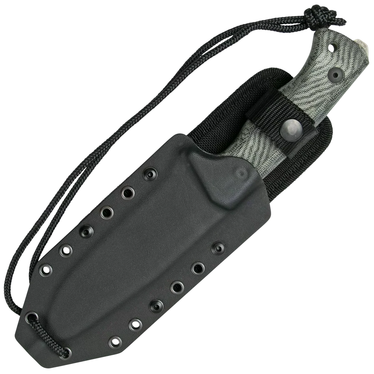 T6 is the last born in the fixed blade family, and it stays in betwen the M7 and the T5 in terms of dimensions. It is the right companion in any camping trip, and every other outdoor situation. It features a strong CPM 3V steel blade and it is equipped with a SOLID® handle, milled out of a Canvas micarta block, which ensure a firm and safe grip. Deisgned by Molletta, the T6 has an aggressive profile and is therefore particularly recommended when there is need for a robust, safe, and easy to handle tactical instrument. Supplied with its Kydex holster provided of reversible Cordura structure with M.o.l.l.e. system for safe and easy carrying, the T6 is available with satin-finished or “Old Black” treated blade.
