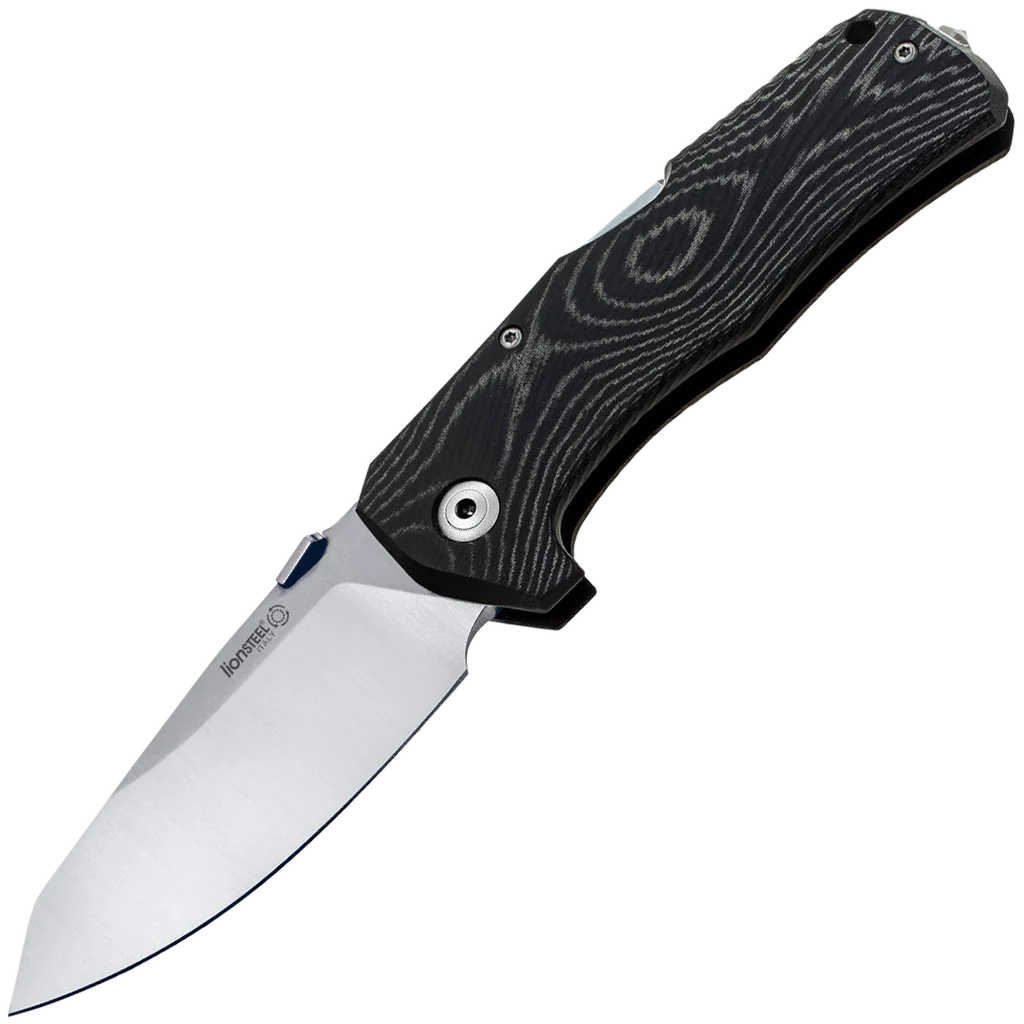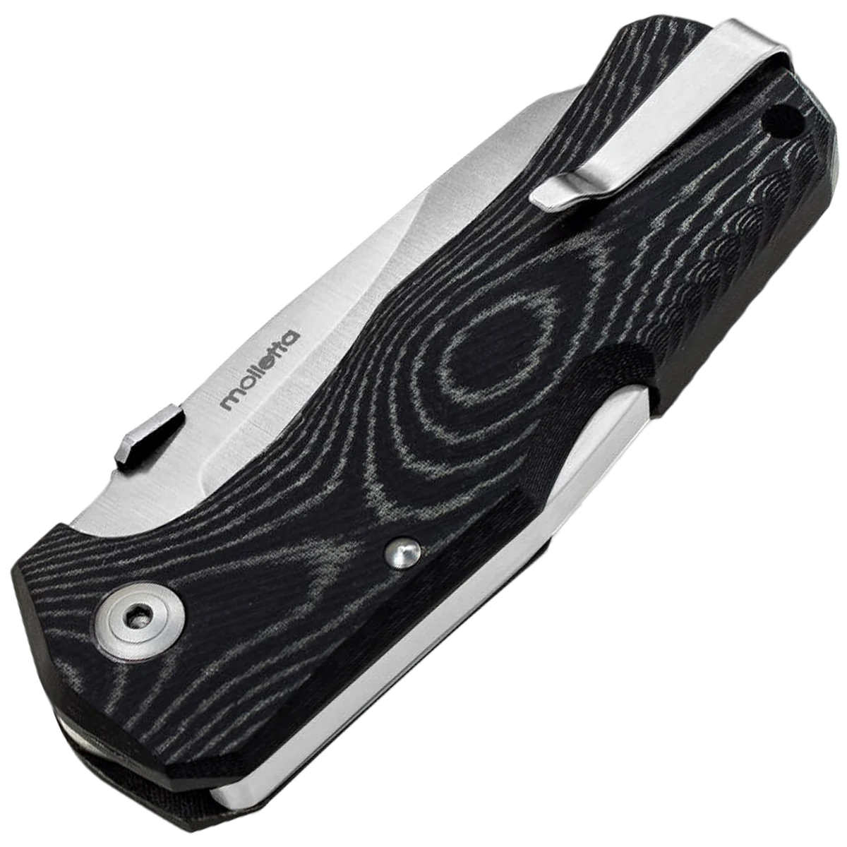 In addition to the well-known and popular SR1 and TiSpine-models, LionSteel also made a pocket knife with back lock called the TM1. The remarkable thing is that the handle, which is provided with subtle curves, is milled from one piece of micarta or carbon. The blade turns extremely smooth thanks to the use of IKBS-bearings. It is amazing how smoothly the blade opens and closes. And to make it all complete, the back of the pocket knife also houses a glass breaker. It is a pleasure to use this knife. The wide blade of Sleipner-steel can be easily opened with one hand by both left- and right-handed persons using the thumb support. The Sleipner-steel has a hardness of 60-61 HRC. This type of steel is classified as one of the hardest kinds of steel. Because of the back lock this knife is perfect for left- and right-handed persons. Knife maker Molletta has delivered a beautiful knife.
