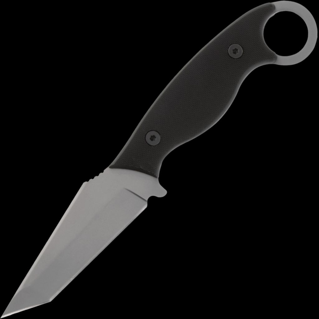 - Fixed blade made from 9Cr18MoV stainless Steel, grey coated finish plain edge in a tanto style blade. Full tang, black G10 handles, large finger hole with included synthetic sheath for transportation.
