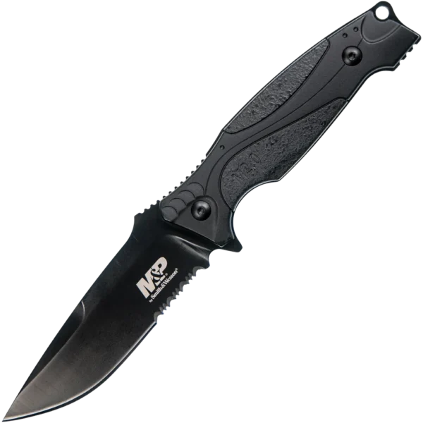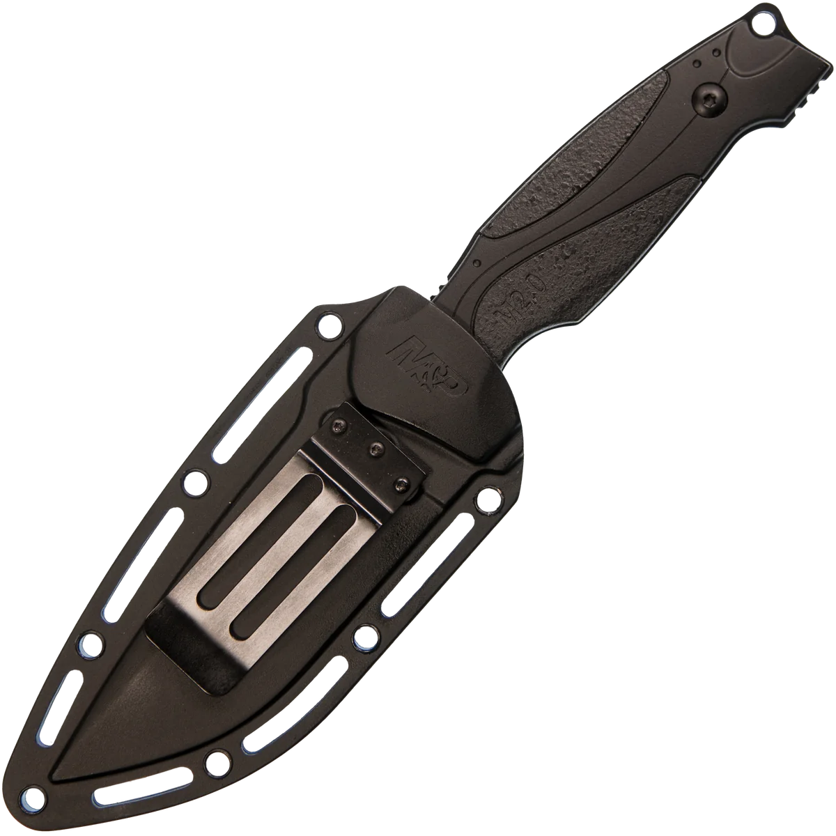 Maintaining the tactical styling and solid feel of the M&P (Military & Police) Series, the Smith & Wesson M2.0 M&P Thin tactical fixed blade features a full tang 4" 8Cr13MoV black blade with a partially serrated edge. 8Cr13MoV is a high-quality stainless steel similar in properties to AUS-8. This steel exhibits extreme toughness and excellent edge retaining capabilities. The rubber overmolded handle scales are sandwiched between the blade tang with excellent fit and finish. The handle is 5" long and is extremely comfortable to hold especially with the index finger groove. The included nylon fiber sheath has a belt clip for convenient vertical-carry and has thumb ramp help unsheath the knife. The M2.0 M&P is a great value compact fixed blade knife from Smith & Wesson.