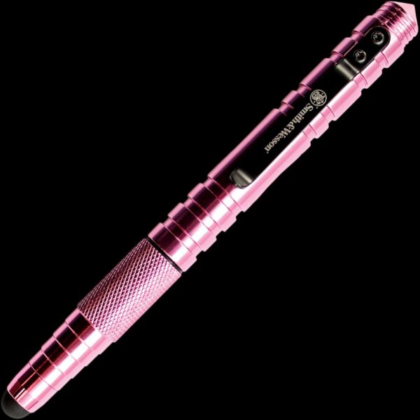 - Tactial style pen made from pink T6061 aircraft grade aluminum, twist cap lid with a stylus tip for use on touch screen devices. Ball point pen with pocket clip for easy transportation.