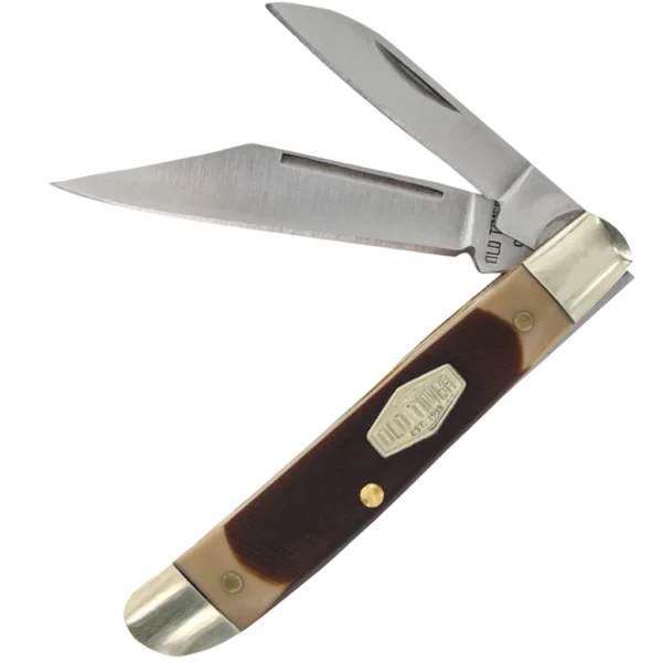 - Old Timer Dog Leg Jack Folding Pocket Knife, 7Cr17MoV Stainless Steel satin finished Clip Point and Pen Blade with Nail Pulls. Brown delrin handles and slip joint mechanism to ensure a securely locked blade.