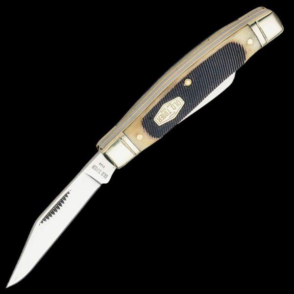 - Old Timer Middleman Folding Pocket Knife, 7Cr17MoV Stainless Steel mirror polish finished clip point, sheepsfoot and pen Blade. Brown delrin handles with silver nickel bolsters to give this knife a classic style.