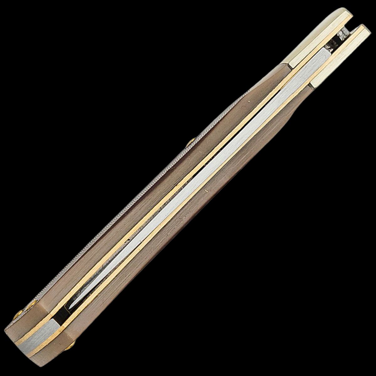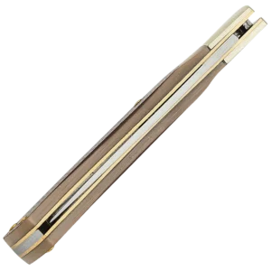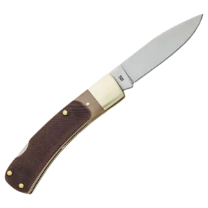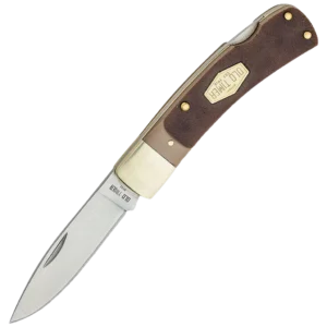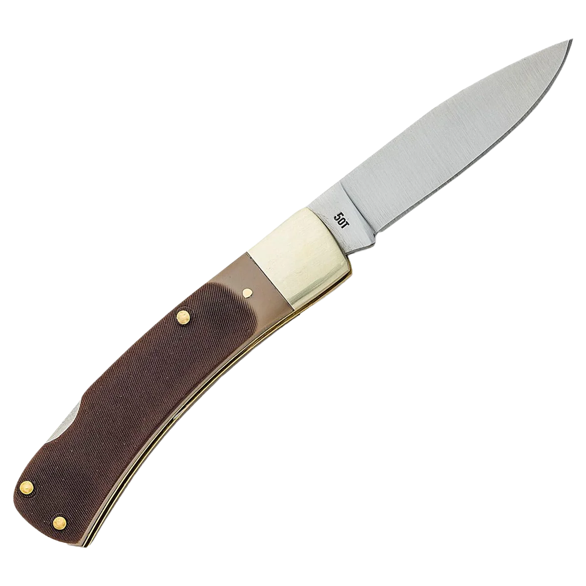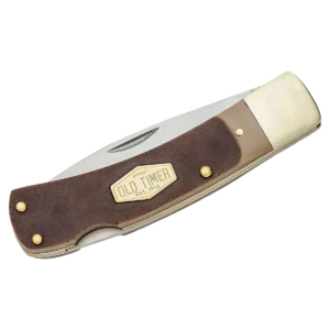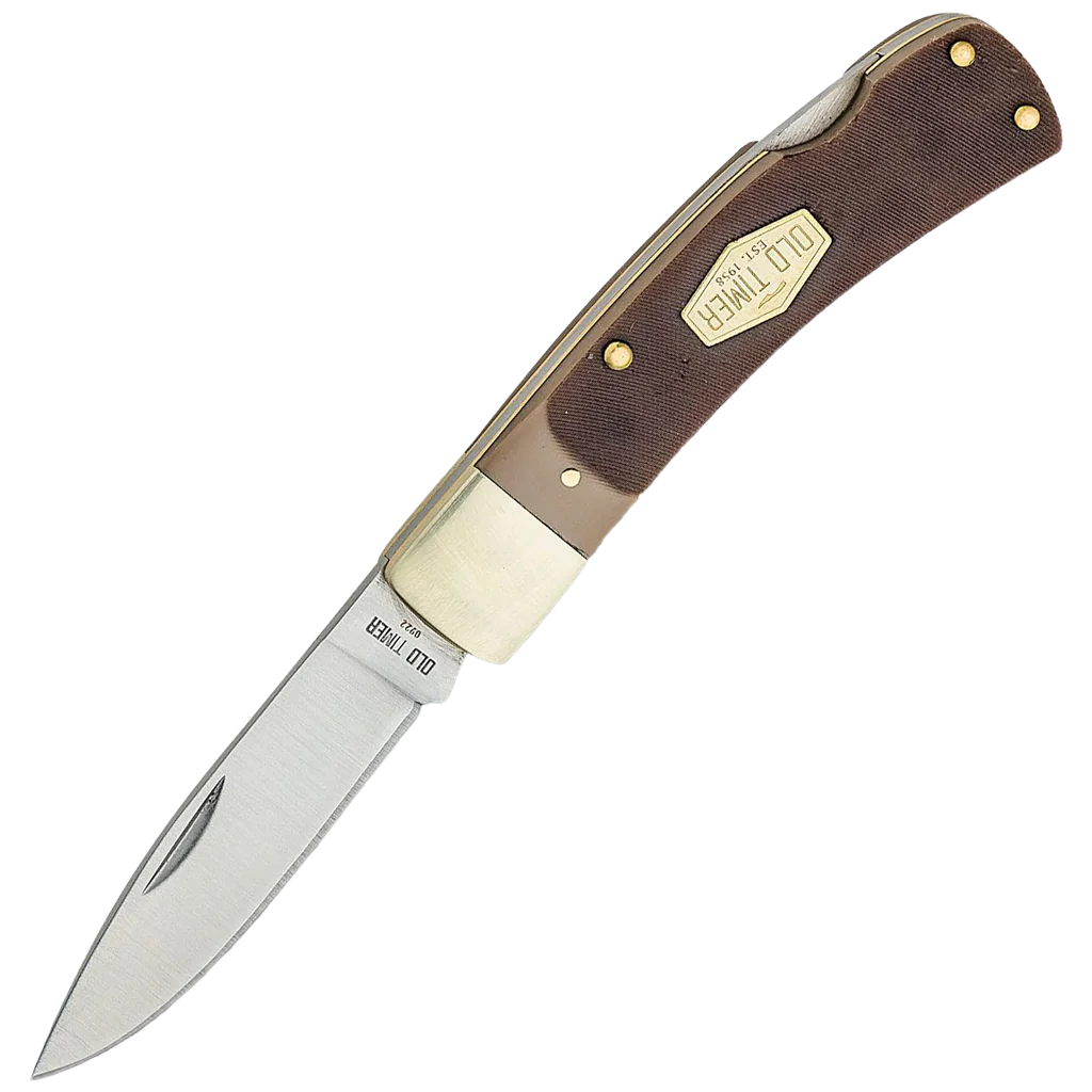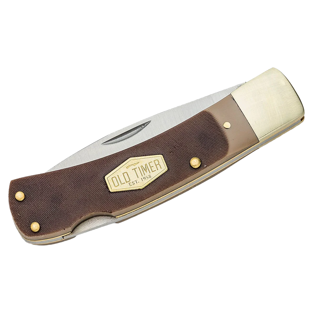 - Old Timer Folding Pocket Knife, 7Cr17MoV Stainless Steel satin finished drop point Blade. Delrin brown handles with silver nickel bolsters to give this knife a classic style. Lockback mechanism to ensure a securely locked blade.