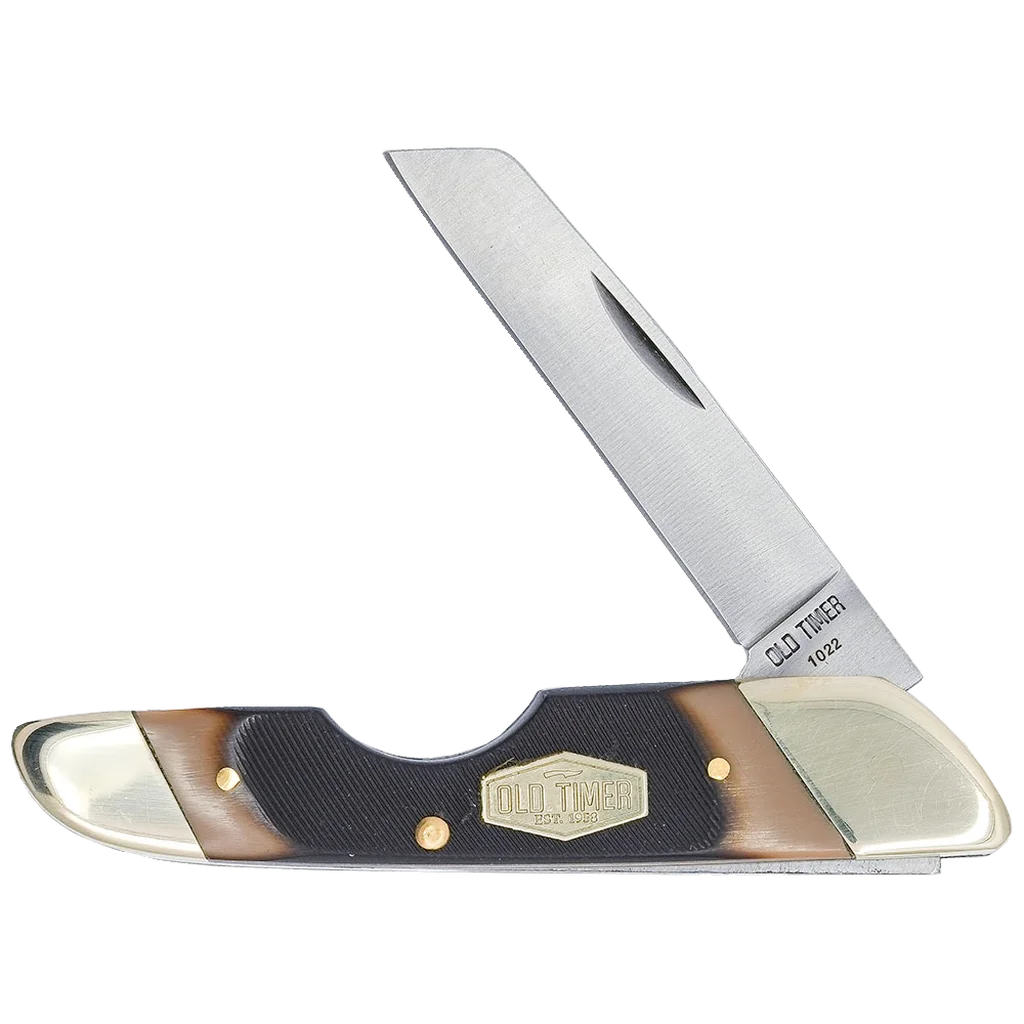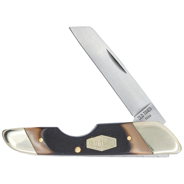 - Old timer folding knife made from 7Cr17MoV stainless steel, satin finished sheepsfoot blade. Brown delrin saw cut handles with nickel silver bolsters to give this knife a classic style! Slip joint mechanism to ensure a securely locked blade.