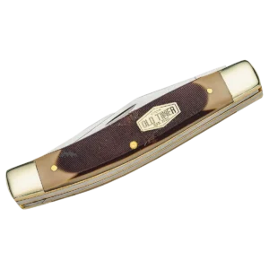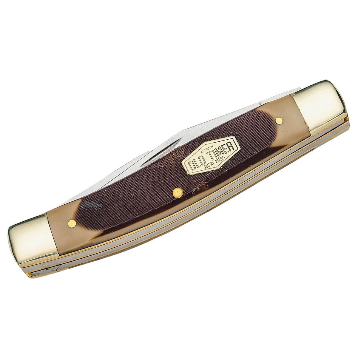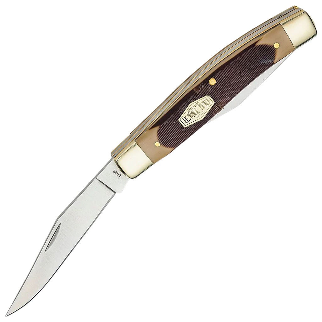 - Old Timer Muskrat Folding Knife, 7Cr17MoV Stainless Steel satin finished clip point Blades with Nail Groove. Brown derlin handles with silver nickel bolsters, slip joint lock mechanism to ensure a securely locked blade.