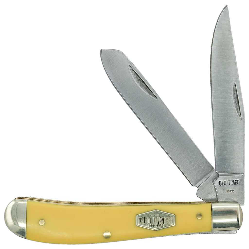 - Old Timer Gunstock trapper Folding Knife, 7Cr17MoV Stainless Steel satin finished clip point and spey Blades with Nail Groove. Yellow delrin handles with silver nickel bolsters, slip joint lock mechanism to ensure a securely locked blade.