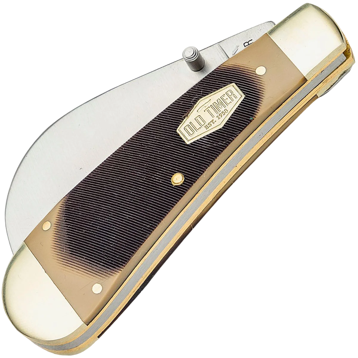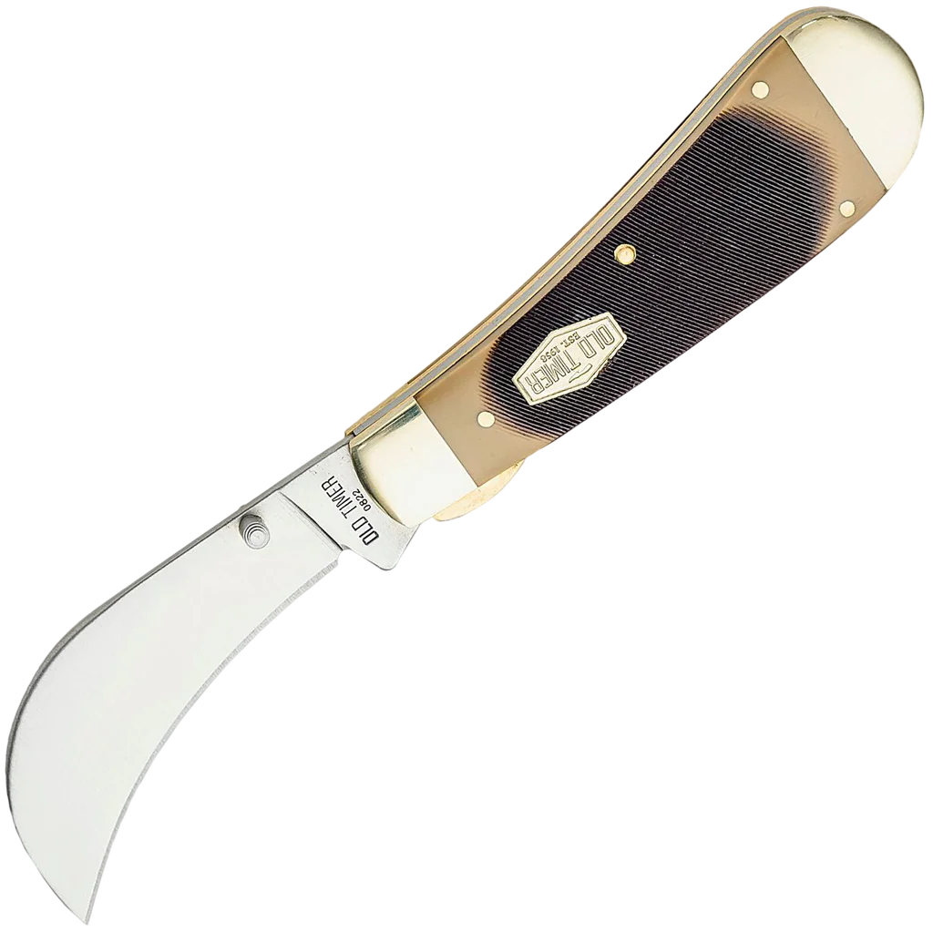 - Old timer folding knife made from 7Cr17MoV stainless steel, satin finished hawkbill blade. Brown polymer saw cut handles with nickel silver bolsters to give this knife a classic style! Slip joint mechanism to ensure a securely locked blade.