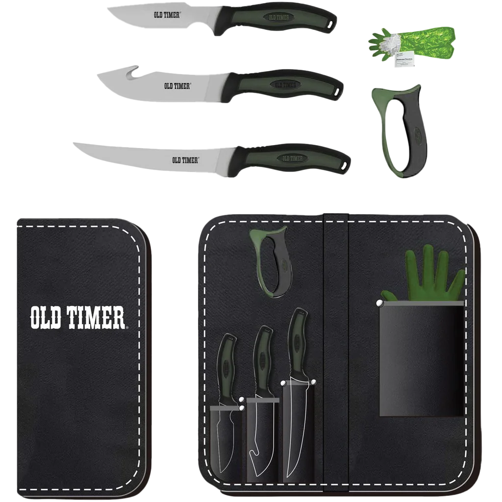 Old Timer Field Dressing Kit has the necessary tools a hunter needs to throw in his pack and process game in the field in one convenient location. Each knife is designed with a comfort grip rubber handle and an included sharpener for repeated use.