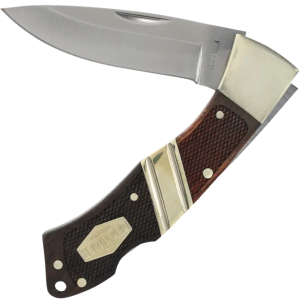 - Old timer folding knife made from 9Cr18MoV stainless steel, satin finished drop point blade. Brown Rosewood and Ebony handles with nickel silver bolsters to give this knife a classic style! Lockback mechanism to ensure a securely locked blade with included brown leather sheath.