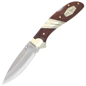 - Old timer folding knife made from 7Cr17MoV stainless steel, satin finished drop point blade. Brown wood handles with nickel silver bolsters to give this knife a classic style! Lockback mechanism to ensure a securely locked blade.