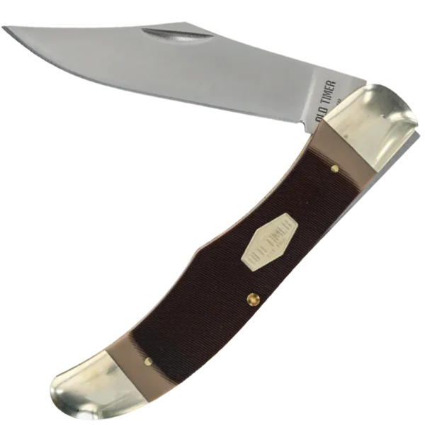 - Old timer folding knife made from 7Cr17MoV stainless steel, satin finished clip point blade. Brown saw cut delrin handles with nickel silver bolsters to give this knife a classic style! Reliable slip joint locking mechanism with included brown leather sheath for easy transportation