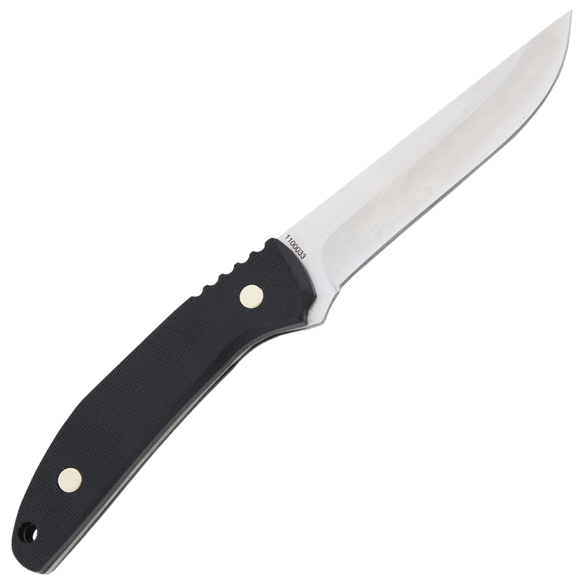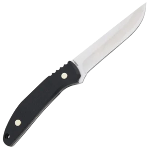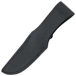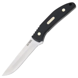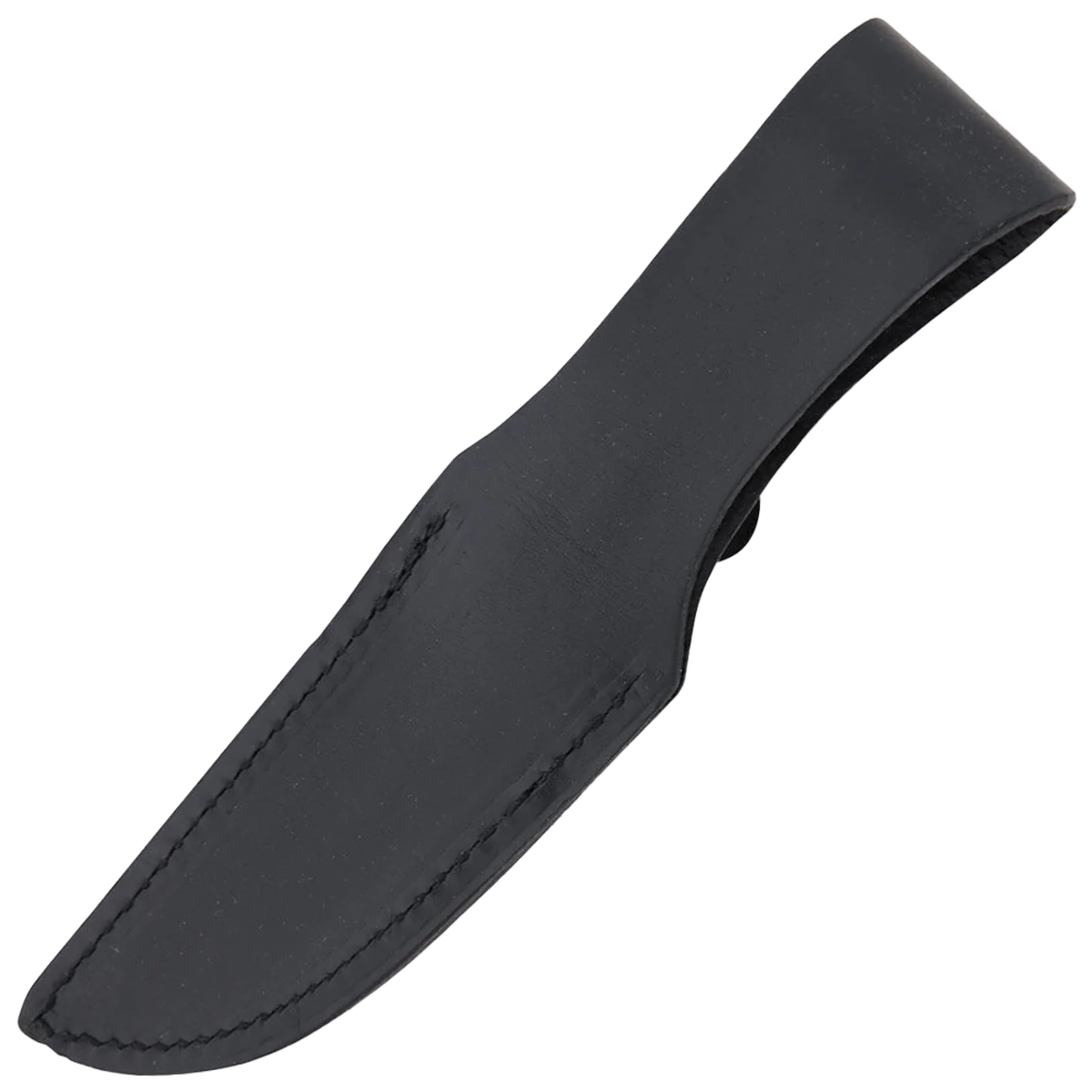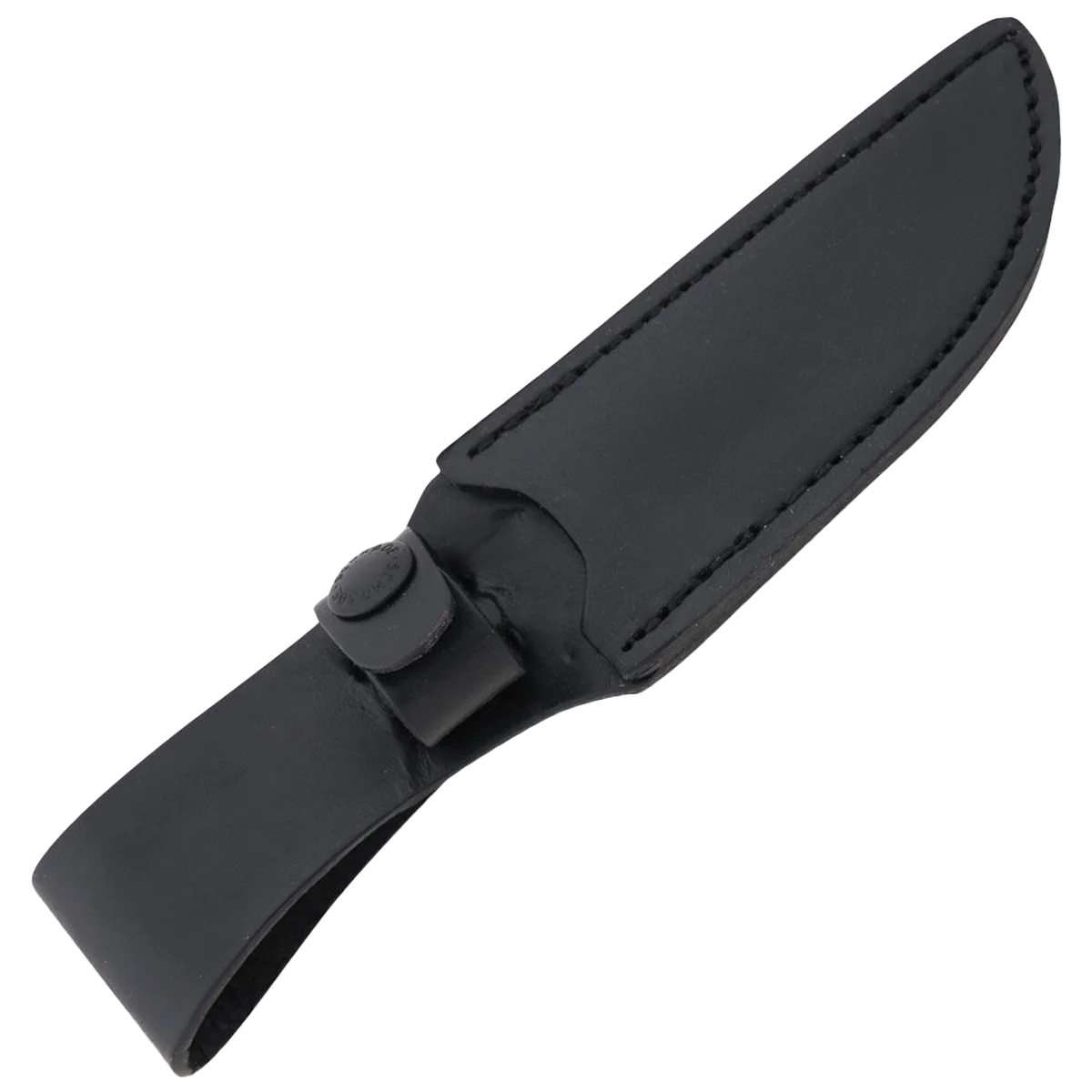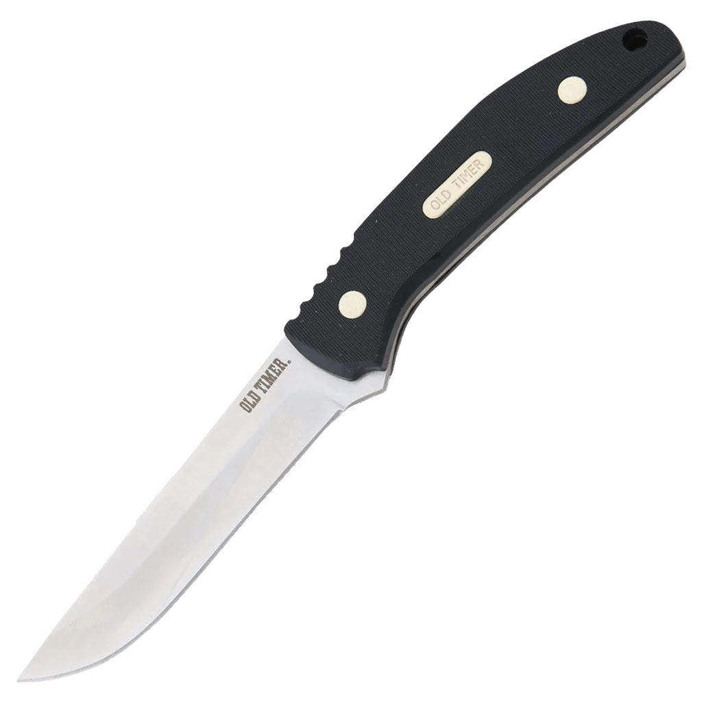 This Old Timer Fixed Blade Knife features a full-tang straight back blade with black sawcut Delrin handles. The handles feel solid and the texturing on them provides an exceptional grip. This is aided by the pronounced jimping on the back of the handle. The knife comes with a black leather sheath and makes a great choice for a utility or camp knife.