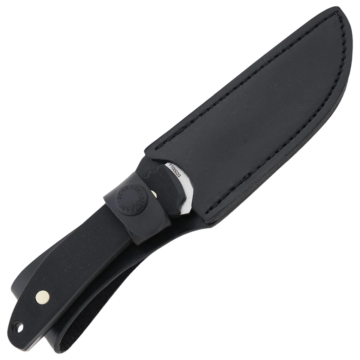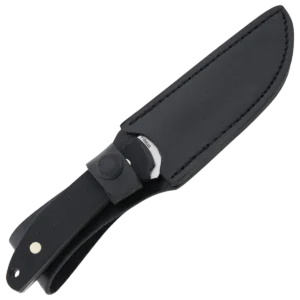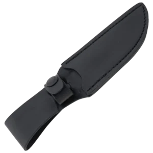 - Full tang fixed knife made from 7Cr17MoV stainless steel, Satin finish blade in a straight back style. Black delrin handles with jimping to improve grip! Also includes a black leather sheath for transportation.