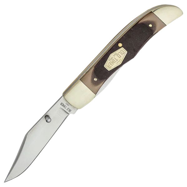- Old timer folding knife made from 7Cr17MoV stainless steel, satin finished clip point blade. Brown delrin saw cut handles with nickel silver bolsters to give this knife a classic style! Liner lock mechanism to ensure a securely locked blade.