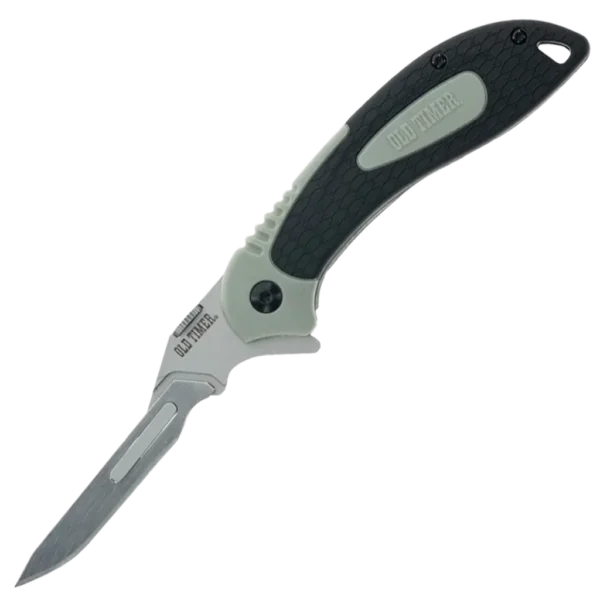 - Folding knife made from 60A Stainless Steel with a satin finish. FRN handles with a TPE rubber overmold, also comes with 2 saw, 2 gut hook and 4 straight blades and a polyester sheath for transportation.
