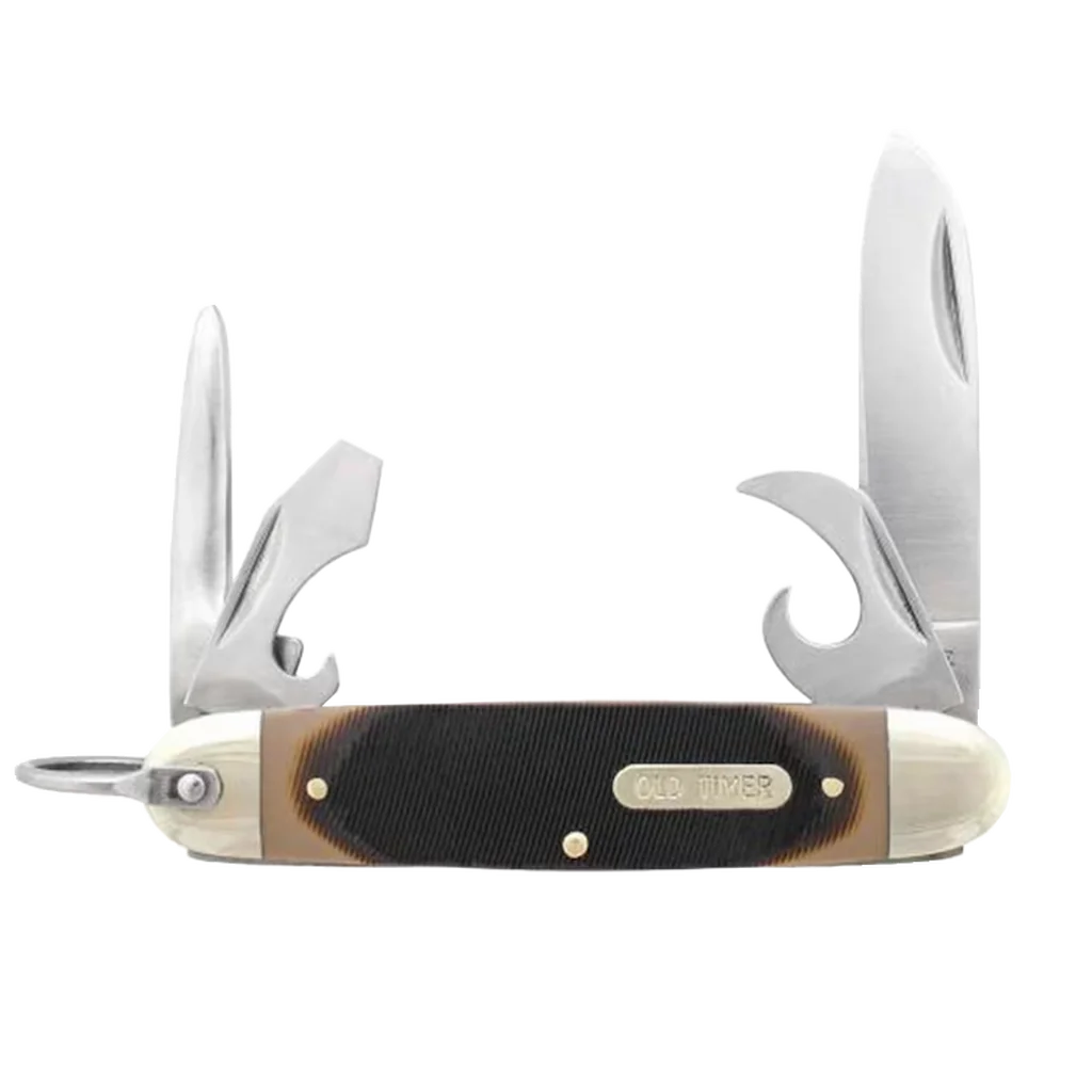 - Old timer folding knife made from 7Cr17MoV stainless steel, satin finished drop point blade, can opener, awl, screwdriver and cap lifter. Brown delrin saw cut handles with nickel silver bolsters to give this knife a classic style! Slip joint mechanism to ensure a securely locked blade.