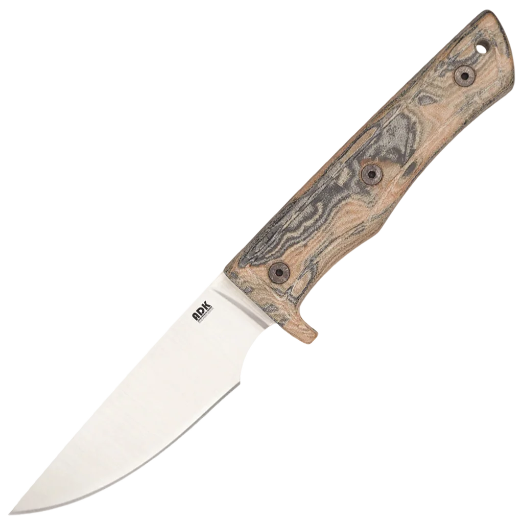 New for 2021, this expanded blade belly and fine point Hunting knife is named for the hunting, trapping and fishing traditions of the Adirondack Mountains of New York State. The ADK High Peaks Hunter Knife features a a 3.6" stainless steel blade with a hardness of 48-52 HRC. The Adirondack Series (ADK) High Peaks Hunter Knife can also be used on smaller game or as a caper. Equipped with a beautiful Micarta Handle, the High Peaks Hunter Knife comes complete with a leather sheath and measures 9.4" in overall length.