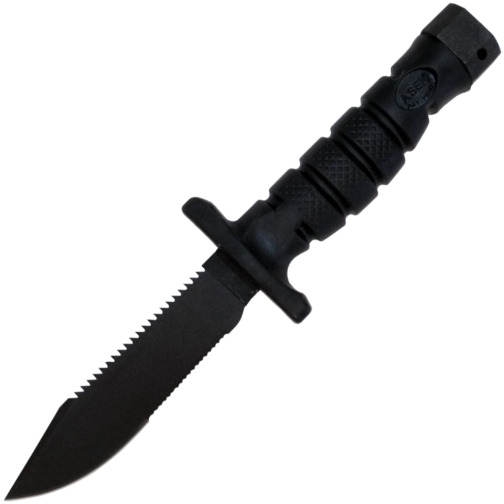 The Aircrew Survival Egress Knife or ASEK® is used by the U.S. Army’s Air Warrior Program and other branches of the U.S. Armed Forces. This useful survival kit's features include: Partially Serrated Edge Sawtooth Spine Electrically insulated, molded handle with holes that can be used to lash the knife as a spear Glass Breaker butt cap that can be used as a hammer Lanyard hole Flame retardant, MOLLE Compatible nylon sheath w/Kydex® insert and two leg straps Anodized aluminum strap cutter w/screwdriver, honing rod, lanyard and replaceable blade