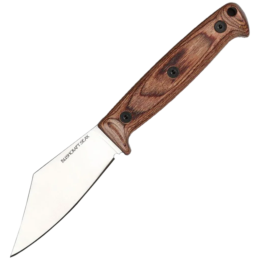 The Bushcraft Seax is the latest addition to Ontario's Bushcraft series. Based on the historic Anglo-Saxon seax (seax is the Old English word for knife) it is a design that was popular from about the 7th-12th century. The deep clip forms a narrow point which is optimized for fine cutting work and only 1/4" above the blade edge line to maximize cutting forces similar to a sheepsfoot blade edge. The hilt is the ergonomic and time-tested Bushcraft Field Knife hilt and the handle scales are made of laminated hardwood. Overall the knife reflects the over 500-year tradition of functional seax design made with modern materials and technology.