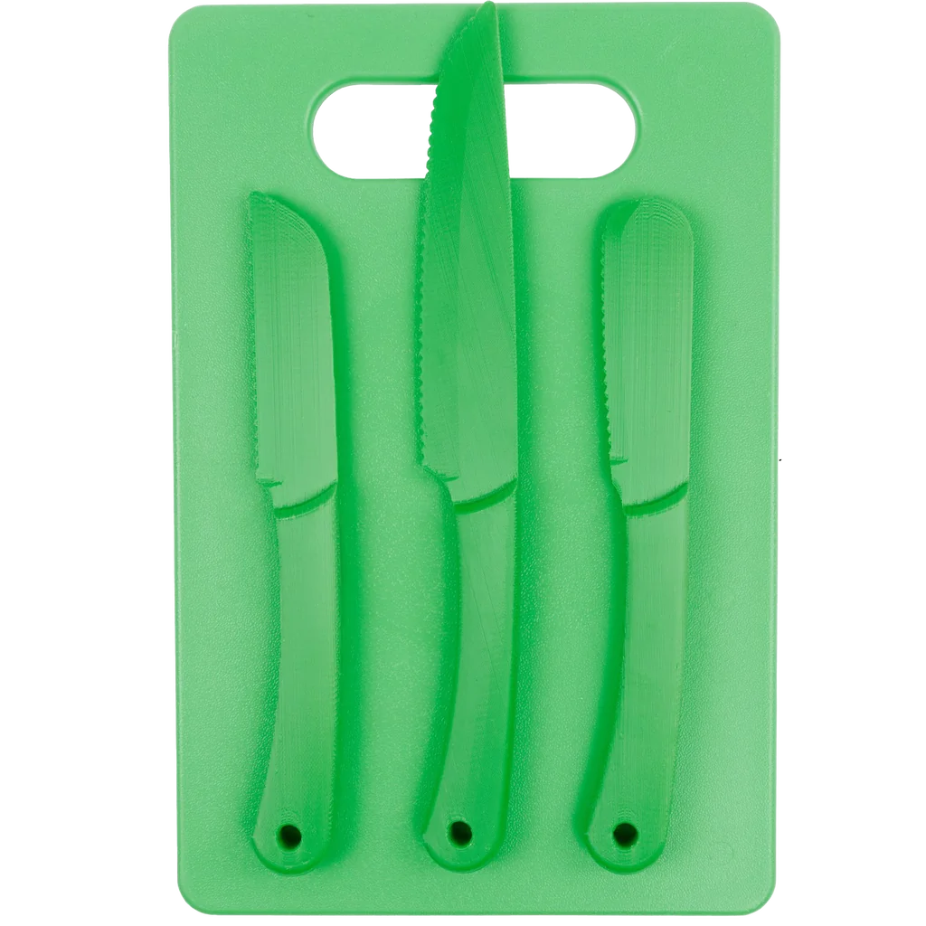 - Fully plastic, colourful, and safe knife set, designed to be child-friendly.