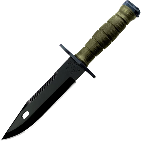 The Ontario Knife M9 Bayonet is a fixed blade bayonet and one of the few American made bayonets available today. The Ontario M9 Bayonet comes with a .235" thick, 7" long blade made of 420 Modified Stainless that has been Sub-Zero Cryo Heat Treated. Black Oxide non-reflective finish is applied to each blade, while the back features milled sawteeth. The handle is tough grooved & textured glass reinforced nylon with a weather-resistant zinc phosphate coated steel guard and cap. A quick release universal military holster system has been incorporated for attachment onto web belts, and grip serrations have been added into the scabbard itself.
