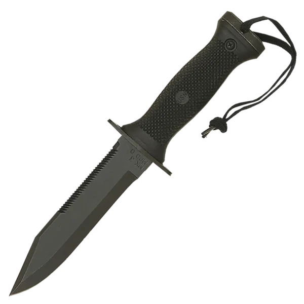 The MK-3 Navy Knife from Ontario OKC is part of their Military Issued line of knives. It has a black oxide coated 440A steel blade with sharpened clip point and serrated spine. Steel guard and pommel with molded plastic handle that is textured for grip. Overall, the Mark III Navy Knife is 10.75" long, consisting of a 6" blade with a 5" cutting edge. The Mark III Navy Knife sheath is also a molded high impact plastic that is equipped with a brass belt loop and hanger. The OKC Mark III Navy Knife is used exclusively by the United States Navy.