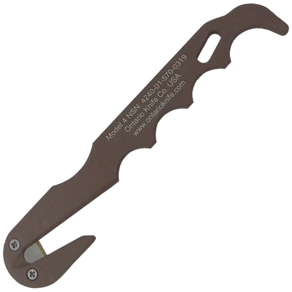 Ontario Knife Company Model 4 Strap Cutter – Super flat tool. Features: • USMC Issued • High strength machined aluminum handle that will not melt or shatter • Finger grooves and hand catch provide sightless orientation • Flame retardant MOLLE compatible sheath • Rescue hook/multi-tool