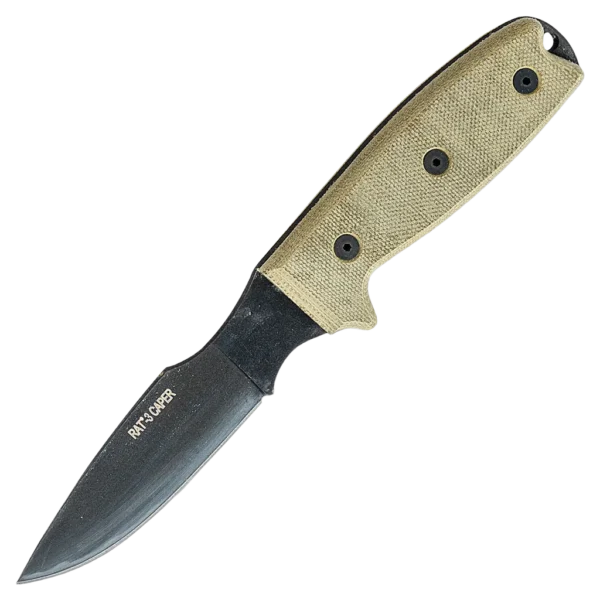 The Ontario RAT-3 Caper 8663 is a solid survival knife and an alternative to the original Rat-3 model. The leaf-shaped blade is made from 1075 carbon steel, which is strong and easy to sharpen. The extremely sustainable powder coating on the blade protects it from the increased corrosion sensitivity of the carbon steel. That is why we recommend you keep this knife dry and possibly slightly greasy. The wonderful properties of this steel guarantee a lifetime of enjoyment. The knife is enhanced with a micarta handle The handle feels slightly coarse which is great because it is comfortable to hold and offers enough grip. The RAT-3 is relatively modest in terms of size and therefore compact and manageable. It is great to always have a knife close when you go out in nature. A knife that is large enough to work with and is also compact enough to comfortably carry with you. The ergonomics of the handle are excellent. The handle is enhanced with a curve for your index finger. Your thumb rests comfortably on the spine of the blade. The ridges on the spine, called jimping, are in exactly the right place. They give you a better grip and more control over your knife. The back of the knife has a large hole for a lanyard. At the back of the handle, the steel sticks out a bit. You can use this part to perform light prying and striking work. It might not be a real glass breaker, but because it is so heavy this knife can break through a thick layer of glass. This Ontario RAT-3 comes with a solid nylon sheath. With the sheath you can always safely take the knife with you and it is MOLLE compatible.