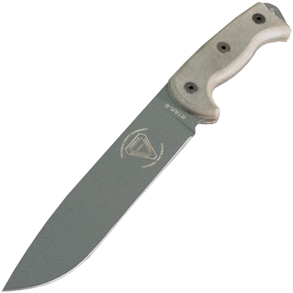 The RTAK®-II w/Nylon Sheath is a large survival-style fixed blade featuring a 10.3" blade made from 5160 carbon steel with a protective powder coat finish. The thick Micarta handle is removable for cleaning. The sheath is a deluxe nylon with a frontal pocket and a hard plastic liner to protect the edge. The RTAK®-II is a survival/utility knife designed by the professional survival training team Randall's Adventure & Training (RAT) and manufactured exclusively by Ontario Knife Company. Designed for: wilderness survival – professional field use – law enforcement – general utility – outdoor and bushcraft activities, and other tasks requiring a durable, comfortable sheath knife.