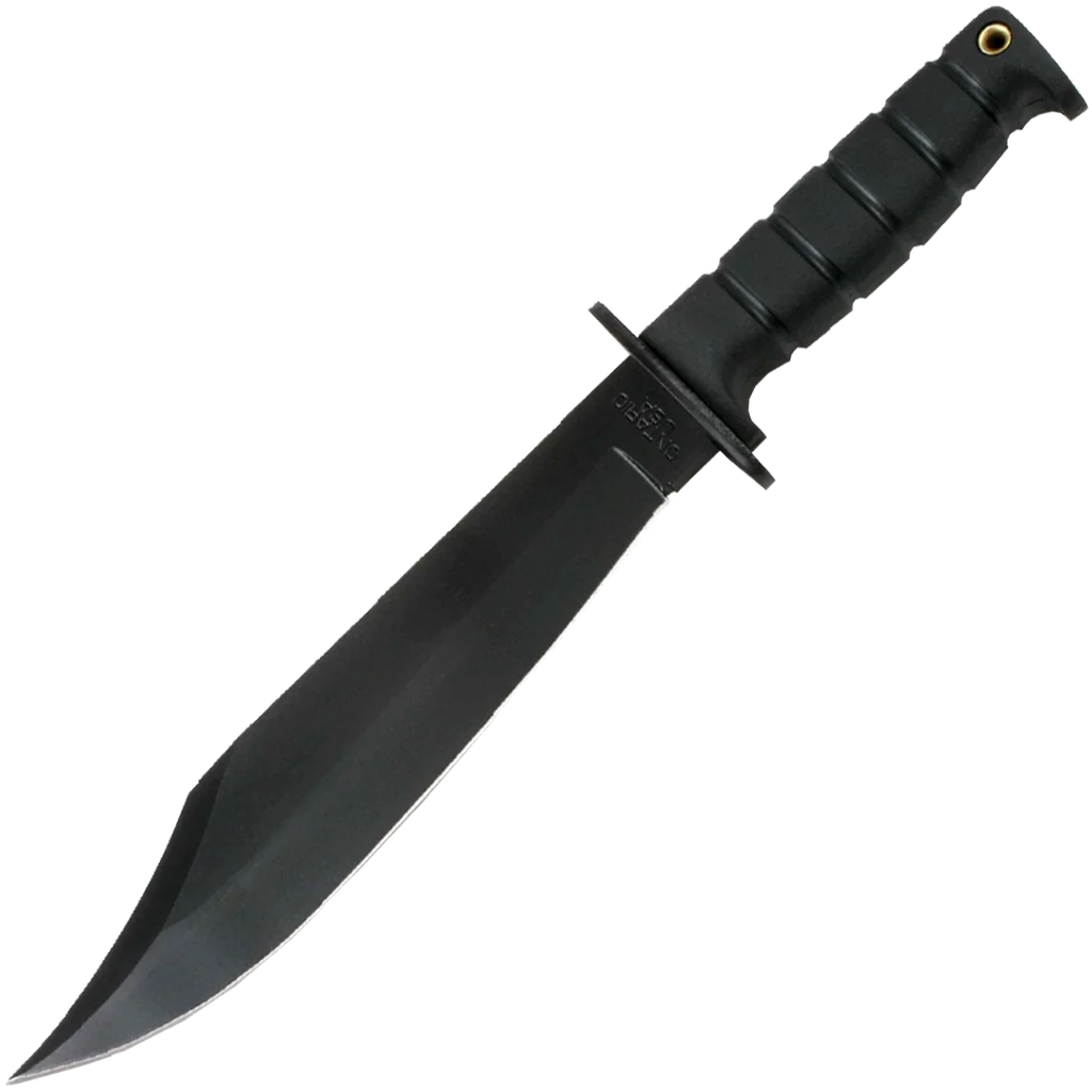 The Ontario SP-10 Raider Bowie is a large fixed knife, made in the United States. It is based on the classic bowie knives from the Wild West, but with a modern and tactical look and feel. The clip point blade is made from 1075 carbon steel. The Ontario SP10 comes with an effective nylon sheath. It can even handle very broad belts (up to 7 cm) and is MOLLE compatible.