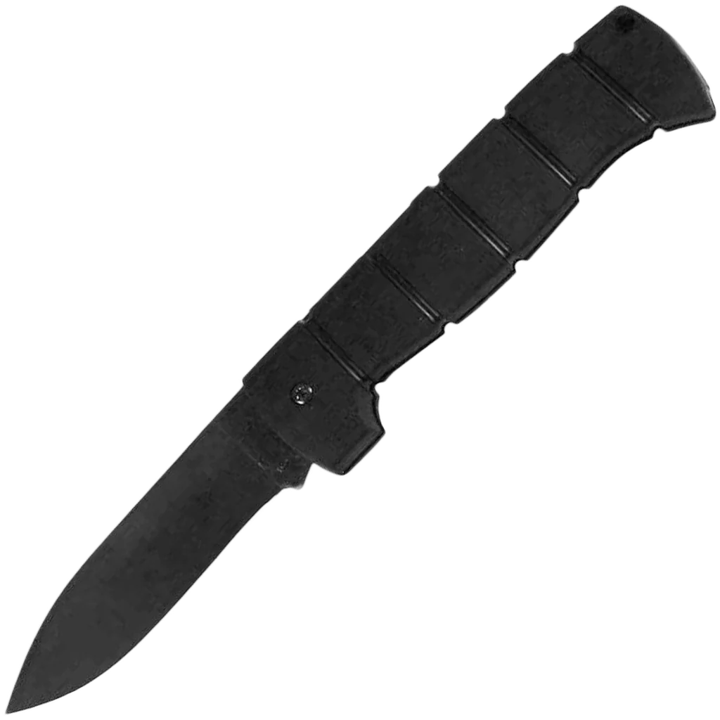 The Spec Plus Folder (SPF) from Ontario Knives is based on the tough Spec Plus fixed blade model. This folding knife features a black coated 1095 steel drop point blade with a plain cutting edge. The blade is full-flat ground and opens with ease using the ambidextrous thumb studs. The Kraton handle is rigid and strong with a sturdy lockback for safe use. The Spec Plus Folder comes with a durable MOLLE compatible nylon sheath.