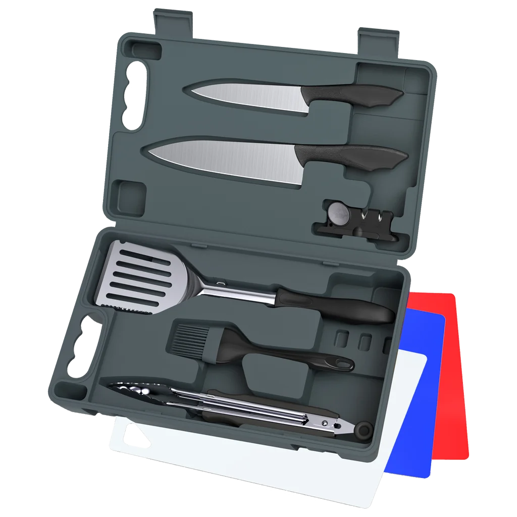 The ultimate portable BBQ-knife sets with all the tools to prepare and grill the perfect meal, in a hard-side carry case. Designed for easy transport and storage, these sets are ideal for both home use and everything outdoors from camping to tailgating, hunting, fishing, RVing and catering. Each set includes professional grade chef’s knives that are perfectly balanced and crafted from German 4116 stainless steel with soft, non-slip TPE handles. Three full-size colored cutting mats provide a variety of surfaces for preparing meat, fowl, fish, fruits and vegetables. Each grill tool features a sliding shaft that telescopes and locks to a full-length of 17" for safe grilling, and then retracts to 14-5/8" for easy storage. The ends of each grill tool are removable for easy cleaning.