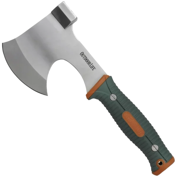 HIGH QUALITY MATERIALS: Made from premium materials. 3CR13MoV satin finish stainless steel blade with hammer head provides an excellent balance of hardness and corrosion resistance. TIMELESS: A love of the outdoors creates lifelong memories that are passed to multiple generations. These products are built with thoughtful designs and materials meant to last and perform when you need them most. DEPENDABLE: Provides consistent cutting and chopping performance and high durability. DIMENSIONS: 3-inch fine edge axe blade, 5-inch handle, 9-inches overall. SPECIAL FEATURES: Axe head has a multi-purpose hammer head on the back side allowing you to drive tent poles into the ground or tenderize meat while cooking outdoors. Orange and green dual injection moulded handle, full tang construction, reinforced nylon sheath.