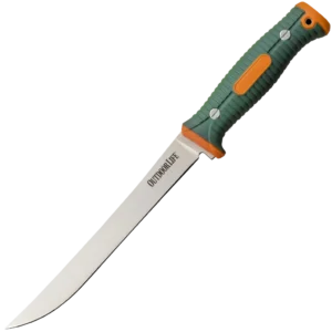 The Outdoor Life Fillet Knife is a fixed blade knife for fishing. The knife's fillet styled blade is made from 5Cr15MoV stainless steel and has a satin finish that makes it both durable and resistant to corrosion. The handle is a two-tone green and orange injection molded nylon fiber-it's comfortable to hold and looks great.