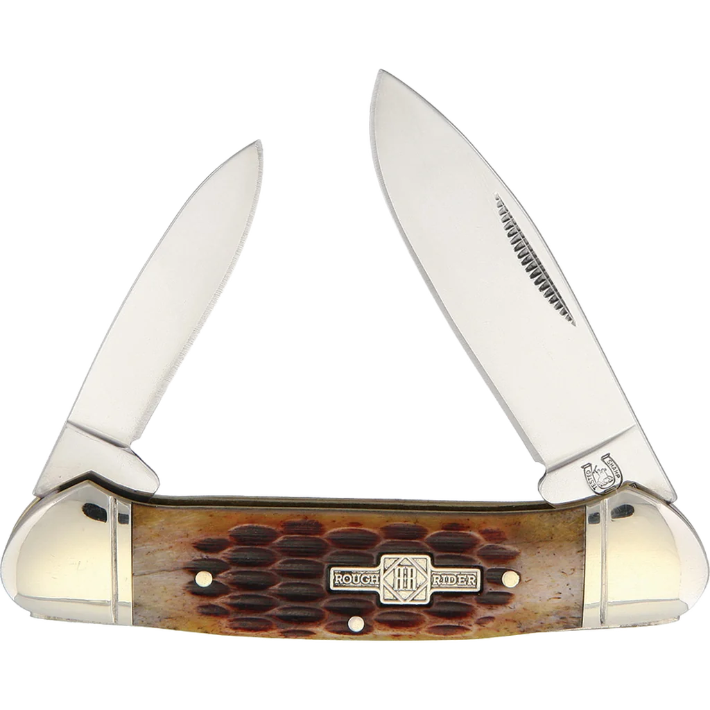The Rough Ryder Amber Jigged Bone Canoe is enhanced with two blades that deploy with nail nick pulls. You open both with two hands and a slipjoint prevents unintentional closing. The handle is made from Amber Bone. This is cow bone that is enhanced with a texture and then coloured. This material has been used for over 100 years for knife handles. Brass pins and liners, ringed nickel silver bolsters, and a nickel silver RR shield complete the folding knife. It's 3.62" closed.
