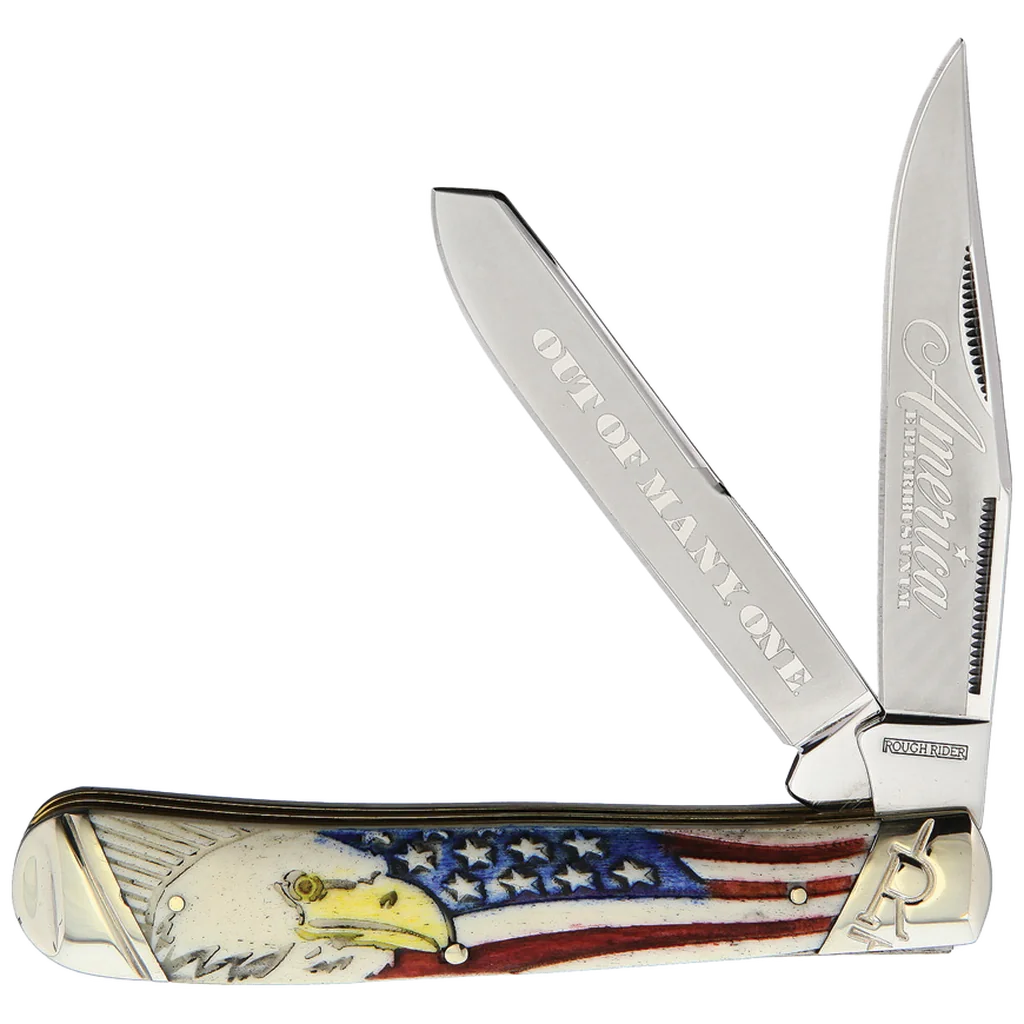 The Rough Ryder America Carved Bone Trapper features 440A stainless steel clip point and spey blades with a satin finish and reverse frosted blade embellishments. The handles are color-washed red, white, and blue bone with a carved American flag and bald eagle graphic, nickel silver pins and bolsters, and brass liners. It's 4.12" closed and weighs 4oz. Includes a collector's display box.