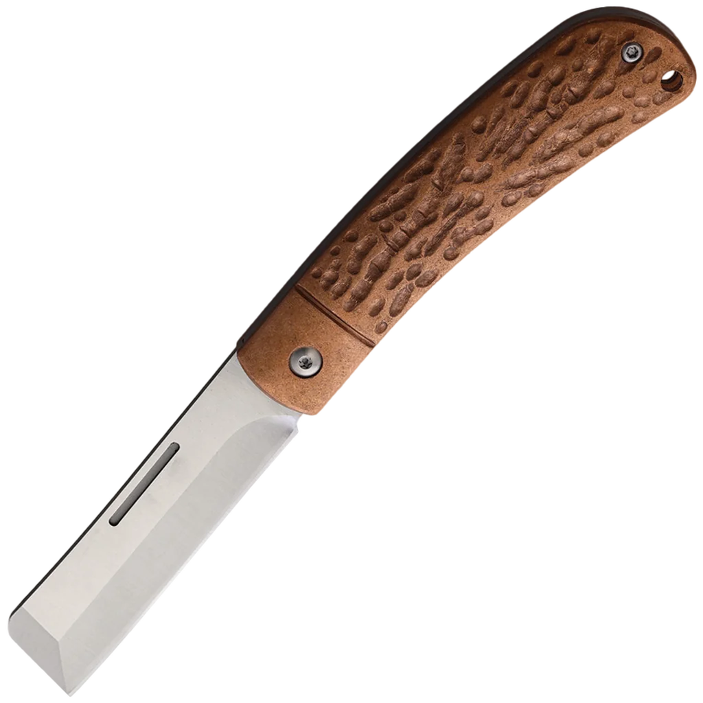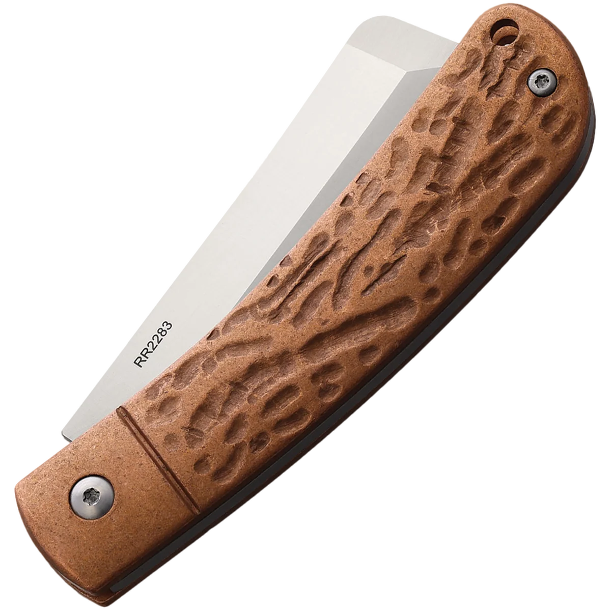 The Apta is Rough Ryder's modern take on the traditional slip joint, offering an irresistible fusion that feels great and works even harder! This copper cleaver version features a 2.75" VG-10 stainless steel blade with a satin finish. The handles are textured copper with stainless steel liners, stainless steel Torx hardware, and a lanyard hole. It's 3.75" closed and weighs 5.2oz. Includes a set of extra screws, a Torx driver, and a zippered black nylon mini storage pouch.