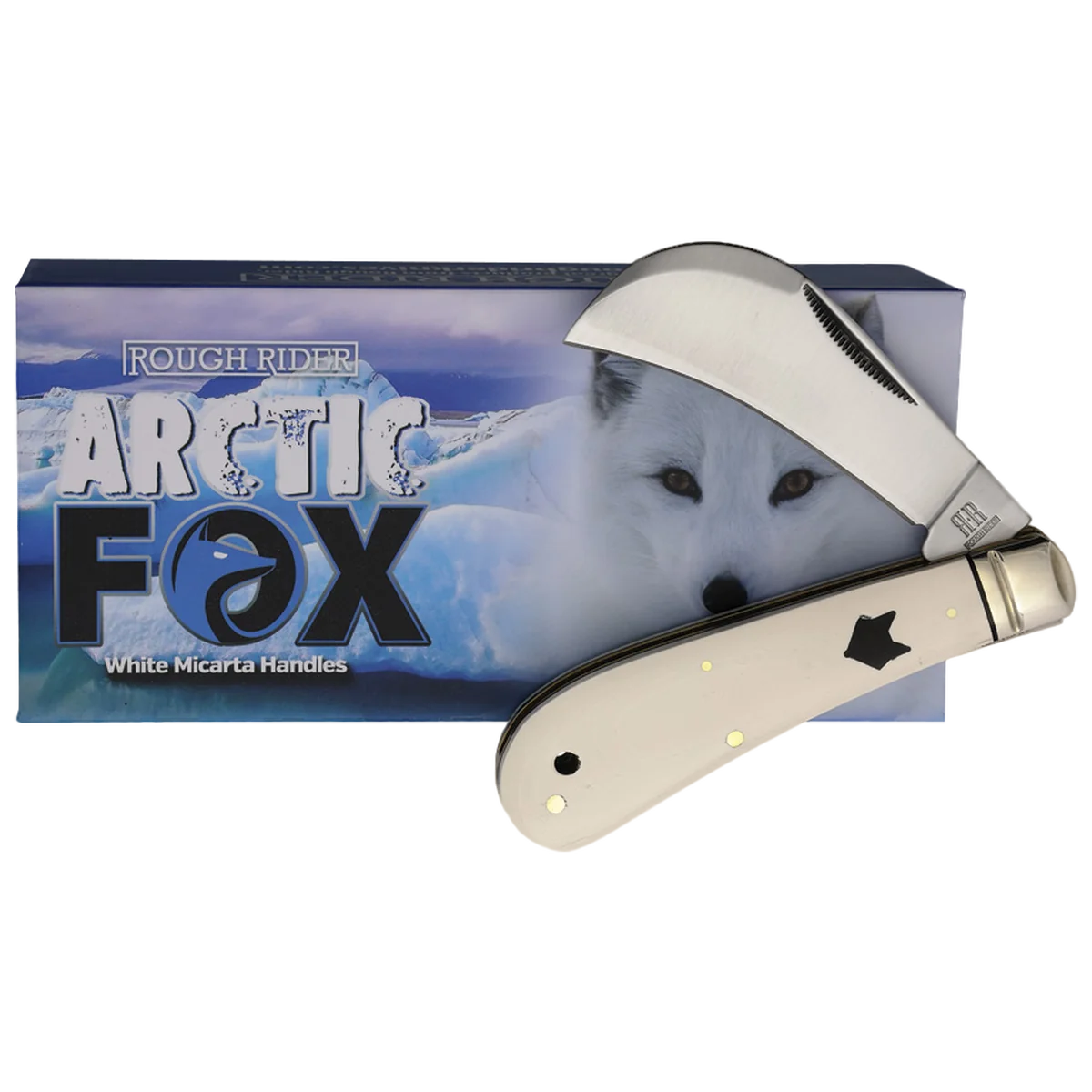 All the knives in the Rough Ryder Arctic Fox Series feature 440A stainless steel blades with a nail nick pull and satin finish. The handles are snowy white Micarta with brass pins and liners, ringed nickel silver bolsters, and an eye-catching Arctic Fox Rough Ryder shield. 4" (10.16cm) closed. Satin finish stainless hawkbill blade. White smooth micarta handle. Nickel silver bolster(s). Inlay shield. Lanyard hole. Boxed.