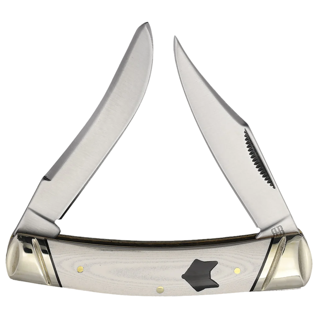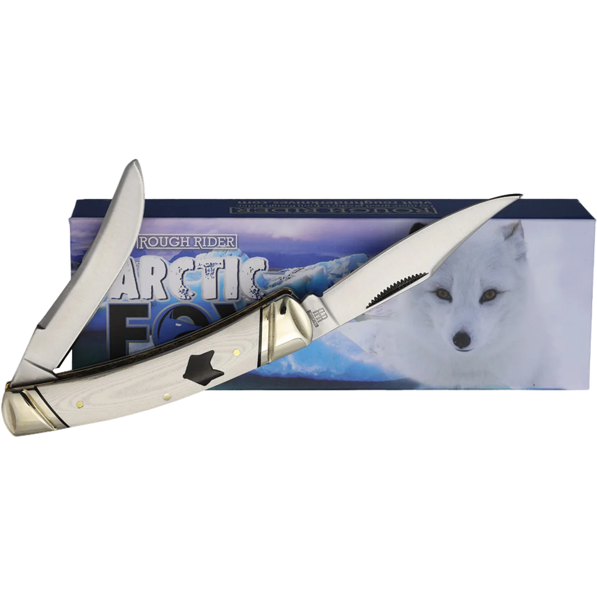 All the knives in the Rough Ryder Arctic Fox Series feature 440A stainless steel blades with a nail nick pull and satin finish. The handles are snowy white Micarta with brass pins and liners, ringed nickel silver bolsters, and an eye-catching Arctic Fox Rough Ryder shield. Arctic Fox Series. 3.5" (8.89cm) closed. Satin finish stainless clip and long spey blades. White smooth micarta handle. Nickel silver bolster(s). Inlay shield. Boxed.