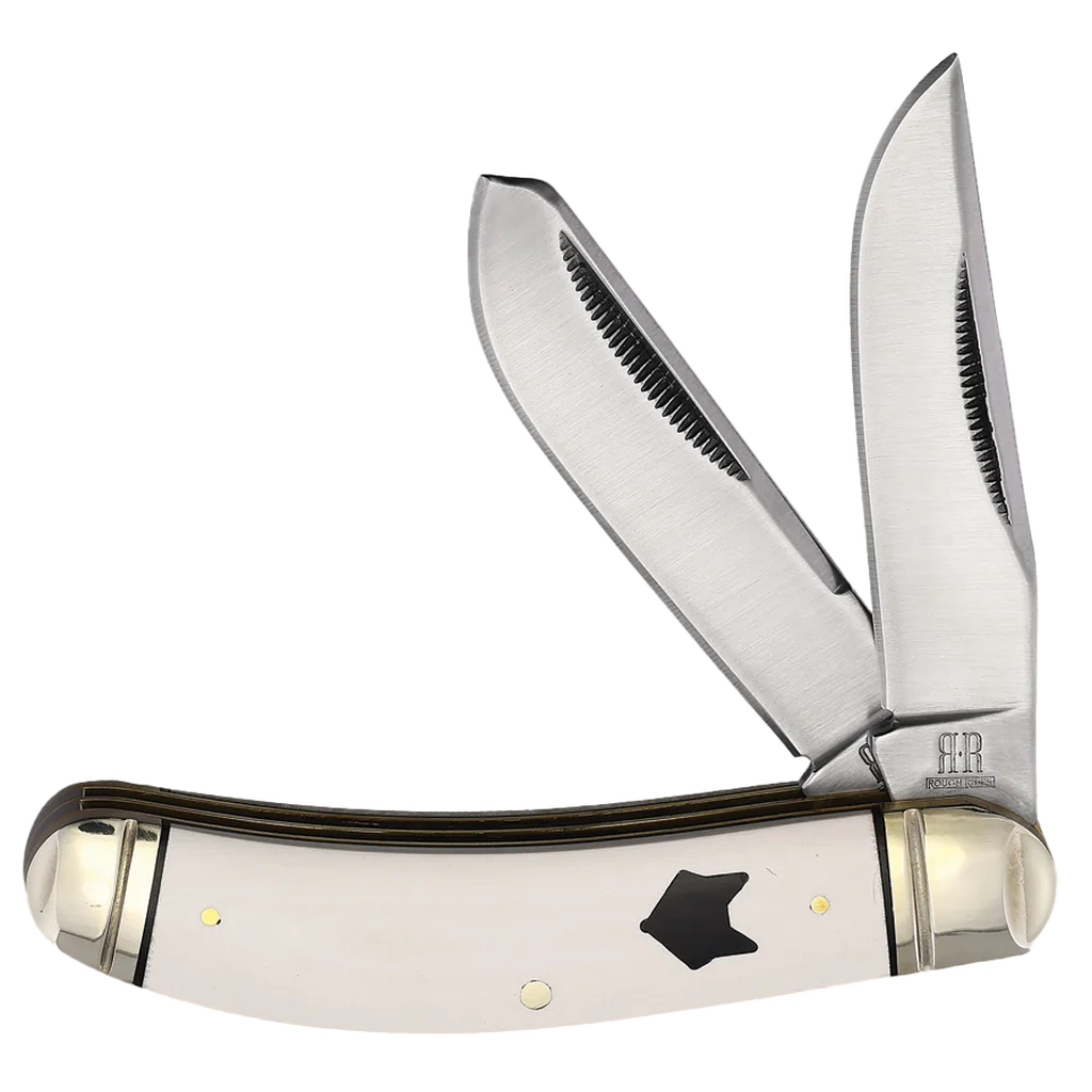 The Rough Ryder Arctic Fox Sowbelly Trapper Folding Knife embodies a perfect blend of elegance and rugged durability, making it a standout choice for knife enthusiasts and collectors alike. Crafted with Rough Ryder's trademark commitment to quality, this knife is designed to meet the needs of those who value both functionality and style in their everyday carry. The knife features two versatile blades a clip point/ spey both made from high-quality 440A stainless steel. Known for its excellent edge retention and resistance to corrosion, 440A stainless steel ensures that these blades are not only sharp but also durable enough to handle a variety of tasks. Each blade boasts a satin finish, giving it a sleek, understated look that complements the knife's overall design. The match strike pull allows for smooth, effortless opening, adding a practical touch to this sophisticated tool. The handle of the Arctic Fox Sowbelly Trapper is where this knife truly shines. Made from snowy white Micarta, the handle offers both a striking visual appeal and a comfortable, secure grip. Micarta is renowned for its toughness and moisture resistance, ensuring that this knife will perform reliably even in harsh conditions. The brass pins and liners add a touch of warmth to the handle's cool, crisp appearance, while the ringed nickel silver bolsters provide a polished finish that enhances the knife's overall elegance. At 3.75 inches closed, the Sowbelly Trapper is compact enough to carry comfortably in your pocket yet large enough to handle a range of cutting tasks with ease. The ergonomic sowbelly shape fits naturally in the hand, providing a secure and comfortable grip during use.