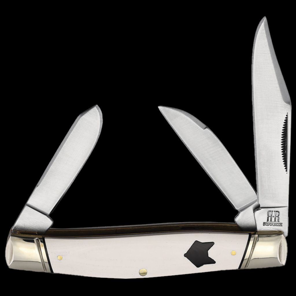 All the knives in the Rough Ryder Arctic Fox Series feature 440A stainless steel blades with a match strike pull and a satin finish. The handles are snowy white Micarta with brass pins and liners, ringed nickel silver bolsters, and an eye-popping Arctic Fox Rough Ryder shield. This Rough Ryder Arctic Fox Stockman has clip point, Sheepsfoot, and spey blades. It's 3.75" closed.