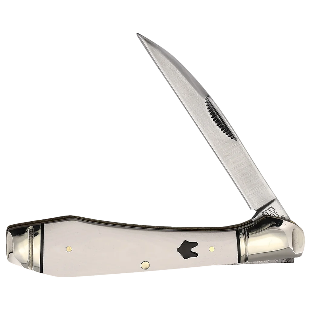 All the knives in the Rough Ryder Arctic Fox Series feature 440A stainless steel blades with a match strike pull and a satin finish. The handles are snowy white Micarta with brass pins and liners, ringed nickel silver bolsters, and an eye-popping Arctic Fox Rough Ryder shield. This Rough Ryder Arctic Fox Wharncliffe has a 2.5" razor-sharp Wharncliffe blade. It's 3.5" closed and weighs 1.7oz.
