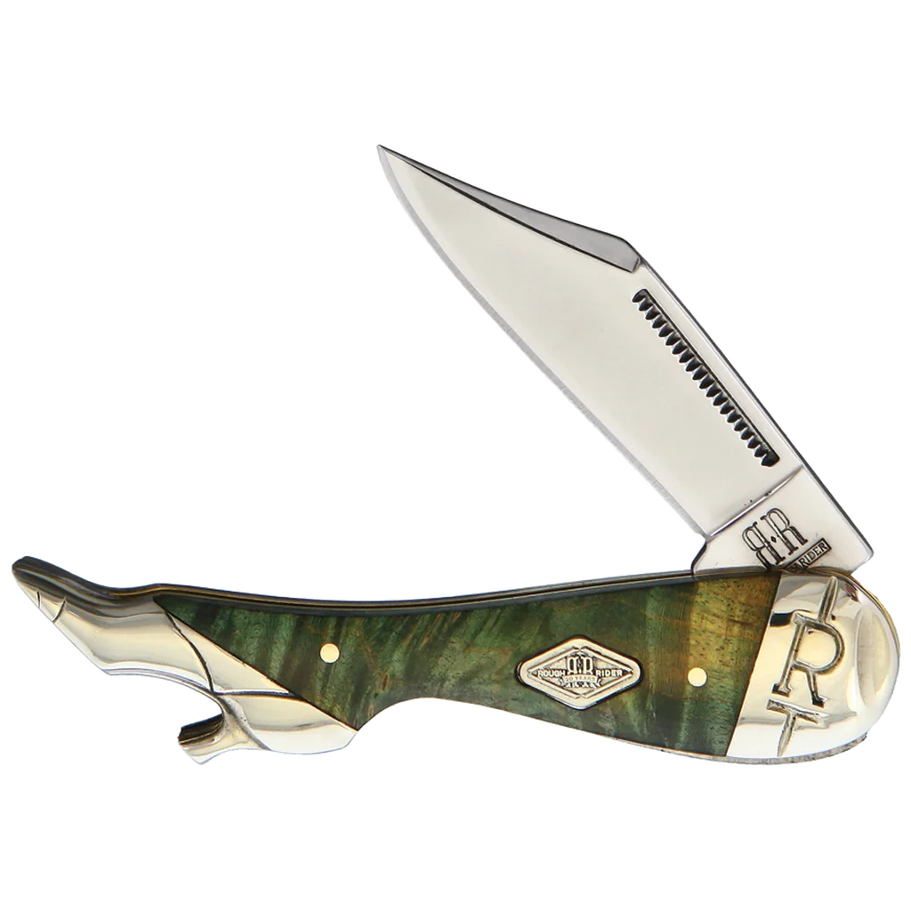 All the knives in the Rough Ryder Artisanwood Series feature mirror polished 440A stainless steel blades with match strike pulls. The handles are smooth burlwood with brass liners, embossed nickel silver bolsters, and a diamond-shaped nickel silver Rough Ryder 20th Anniversary shield. This Rough Ryder Artisanwood Lady Leg has a 2.12" clip point blade. It's 3.12" closed and weighs 1.92oz.